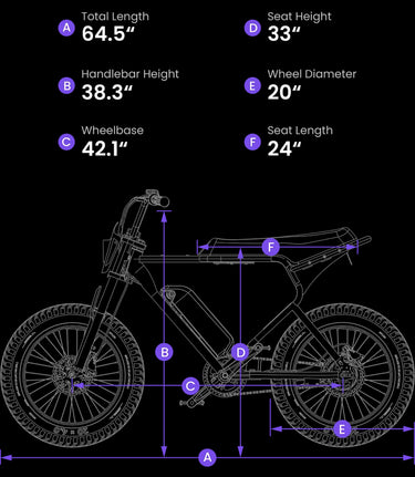 Top Speed 25mph Range 38-76+miles Charge Time 5-6 hrs Battery 500Wh (48V 10.4Ah) Motor 500w Peak Power 750w Throttle Twist Throttle Vehicle Weight 65 lbs L * W * H 71''*27''*42'' Rider Weight Limit 300 lbs Seat Height 33'' Frame Steel Suspension Front Brakes...
